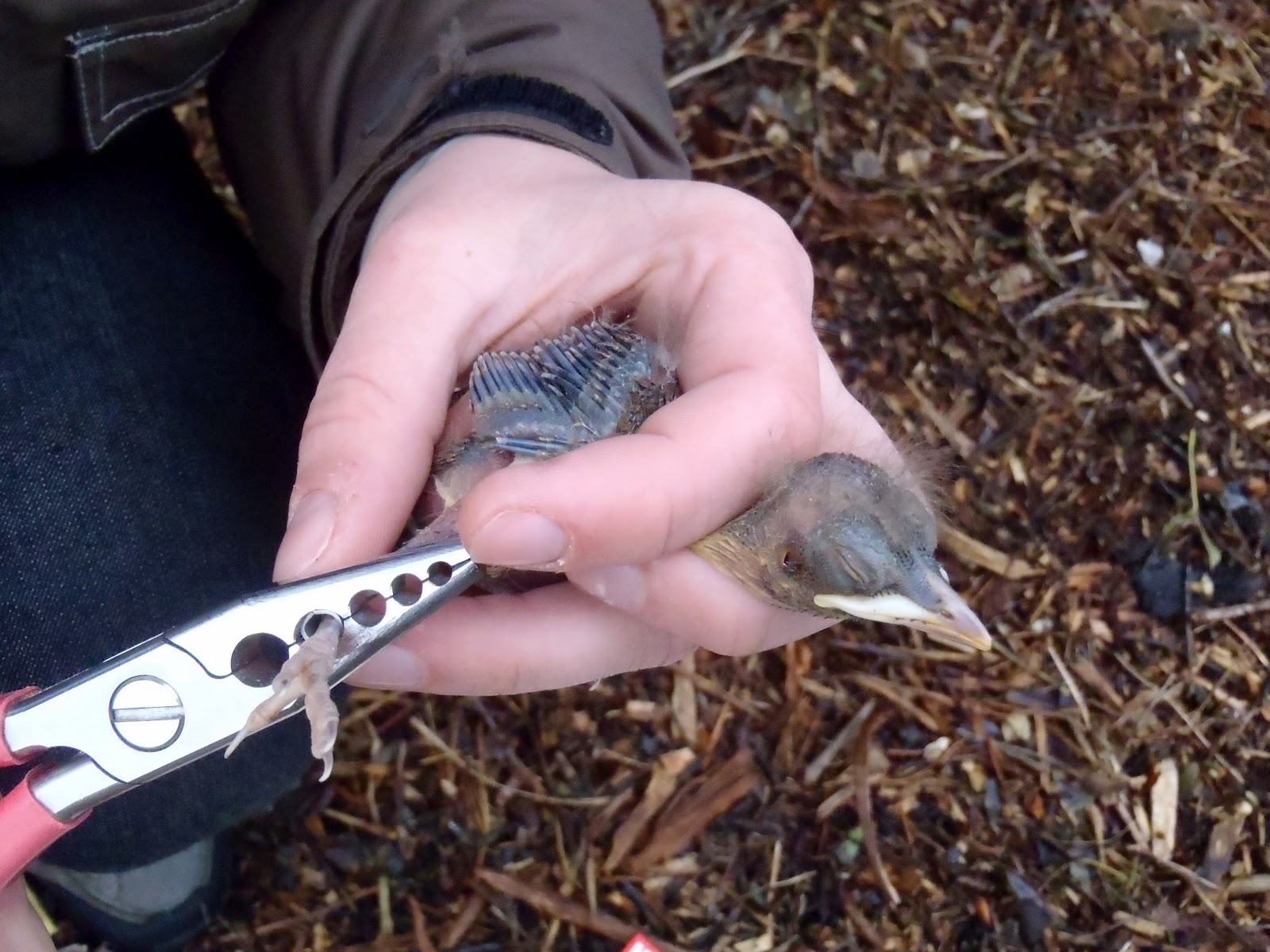 | Carefully adding the uniquely numbered ring to the chicks leg using special ringing pliers |