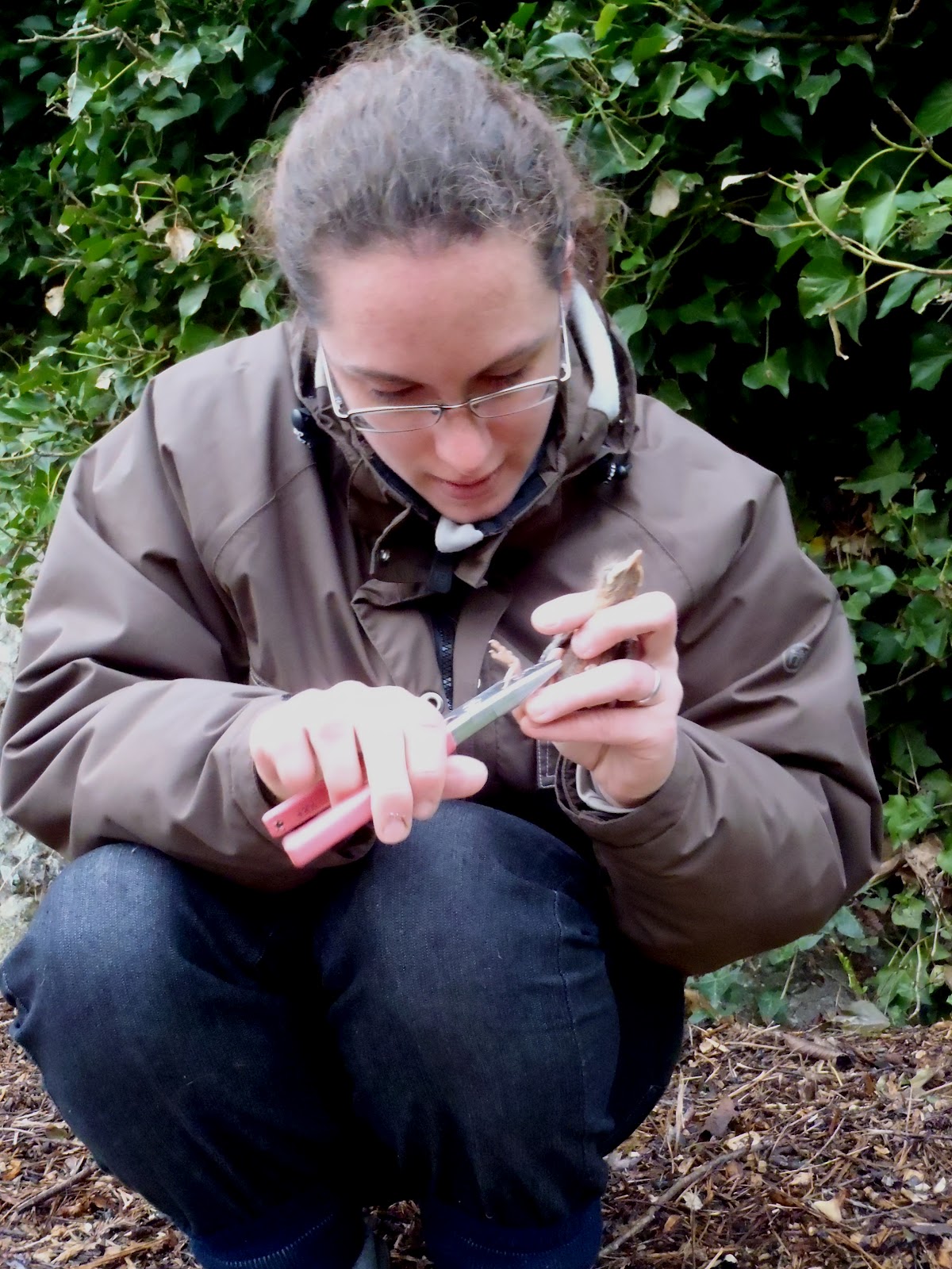 Our luck was in… there hidden amongst the ivy, hidden and protected from most of the rain was the nest, and inside three chicks! With downy feathers giving them a rather scruffy look and wing feathers just starting to peek through, they were the perfect age for ringing.