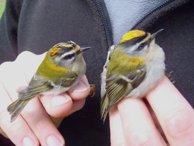 | Male firecrest on the left, with the orange in the crest, the female on the right with just yellow. |
