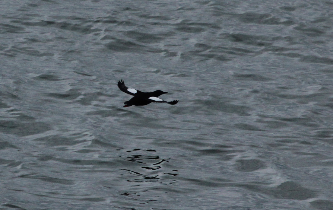 In the meanwhile there were plenty of birds to keep us entertained, including a white-tailed eagle on Mull, whooper swans heading away from Londonderry and whimbrel flying over the Solent as well as feeding along the shoreline on the Isle of Man. Seabirds abounded, with the usual suspects including manx shearwaters, gannets, guillemots, razorbills, kittiwakes and ‘terns’ dashing across our bow. Another highlight was the black guillemots, dazzling with their beautiful black plumage, white wing patches and bright red legs.