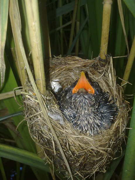 So there nestled deep within and completing filling a neatly woven nest, wrapped around the reeds, was a cuckoo. With longer sheaths on the feathers than any other chick I have seen, the cuckoo looks like a miniature porcupine.