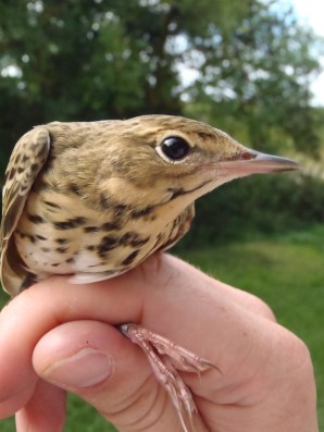 When the wind did ease, the lines upon lines of nets did their job, and while we did not catch the sheer volume of birds one might expect at this site, we never the less caught over 200 birds in the first morning and near on 600 birds on the second. As usual the site did catch some quality species, with wood sandpiper, whinchat, spotted flycatcher, green sandpiper, a handful of tree pipits and redstart being among the highlights. It is not every day that you get to ring 10 grasshopper warblers in a row!