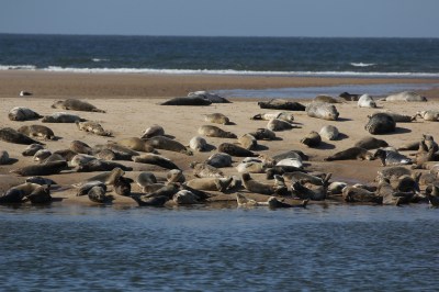 As we approached the end, where the sandy beach is reminiscent of a tropical island, a moaning, wale reaches us on the gently breeze. The source of these eerie sounds lies sunbathing on the opposite bank of the creek… common and grey seals.