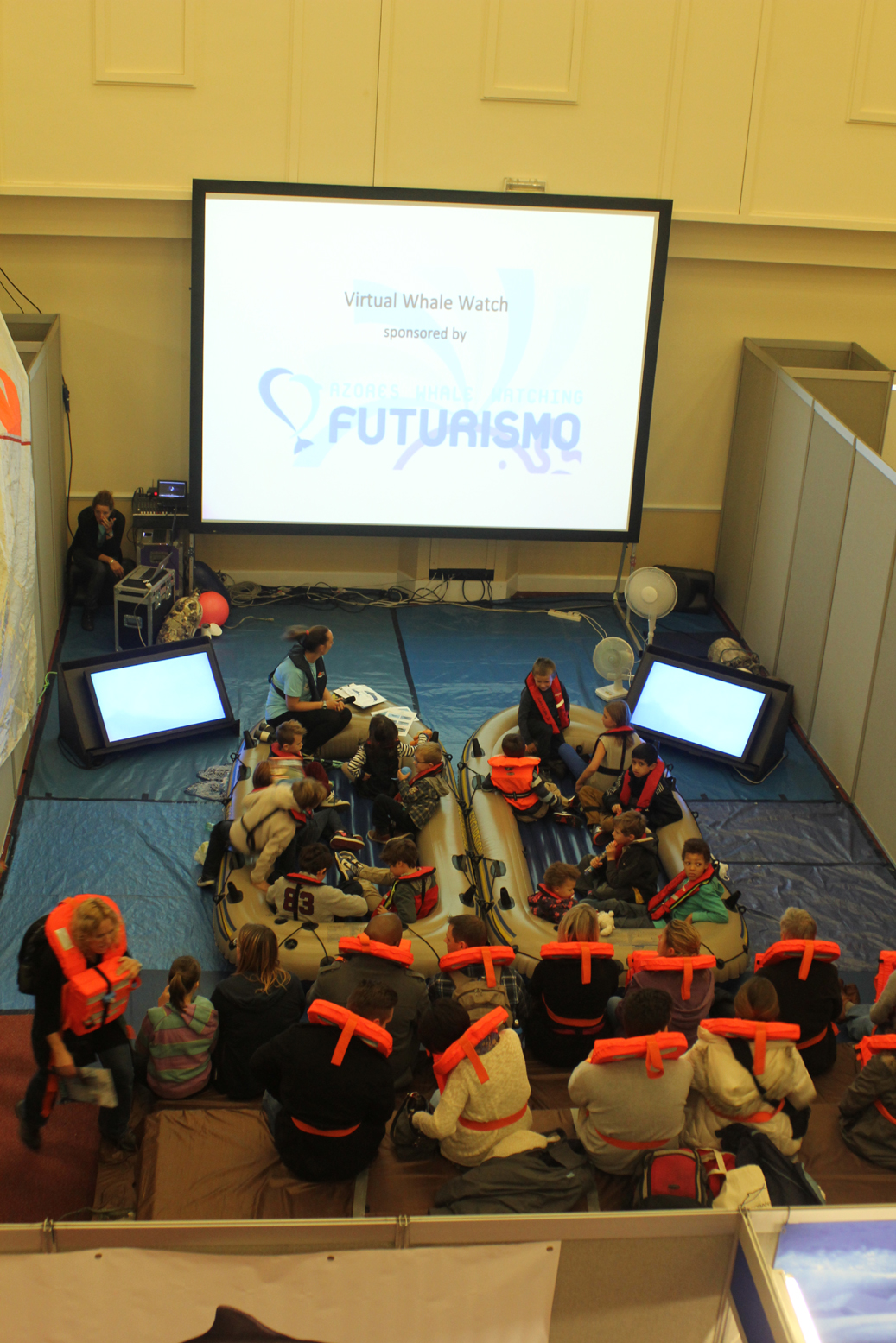 The Virtual Whale Watch took you on a real (well almost) boat, with real water and real footage of whales and dolphins. This year we were off to the Azores, where sperm whales lift their majestic tails into the air in a dive that would take them to untold depths to hunt giant squid, where groups of hundreds of common dolphins came to bow ride alongside our boat and where some very real looking birds swooped over head. For 20 minutes you were there, donning your life jacket and experiencing it for real, watching these magnificent animals, getting sprayed from their splashes and blows, listening to them on an underwater microphone, and getting involved with collecting plastic bags and bottles out of the ‘water’. It was one for everyone to get involved with, from little kids to ‘big’ kids.