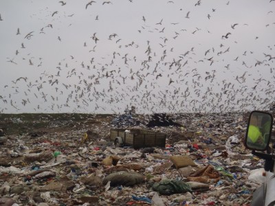 Dwarfed by the compactor and the other trucks on the tip, a white Landrover and trailer bounced and slid its way to a corner of the tip face and near to the sloping edge of the mound. On opening the door a sweet, sickly smell of rotten food and rubbish assaults the senses, but surprisingly you soon become immune only occasionally getting a strong whiff as the morning progresses.