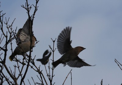 Within a moment or two, a couple lift off from the pole, rapidly followed by the rest; dropping down to a small spindly tree, its thin branches bending under the weight, before they all rush into a low berry laden bush over a low wall. Here they start shovelling berries into their bills, swallowing them whole. A passerby flushes most of the group out, only one or two are brave enough to stay a little longer, before rejoining their companions in the lofty safety of the tree.
