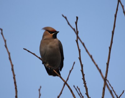 Leaving the warm we venture out into the haze, the cold wind scouring our exposed faces. It’s worth it. Two minutes down the road, and at the top of a telegraph pole are the plump silhouettes, with distinctive crest of 13 waxwings. So confiding we walk right up to the pole. They sit, preening, the tinkling bell of their contact call rings out, and is echoed back by the mimicking starlings on roof tops. The subtle beauty of the waxwing is now clear to see, its buffish pinkish plumage with striking black bib and mask, not to mention the bright yellow and red in the wings and tail.