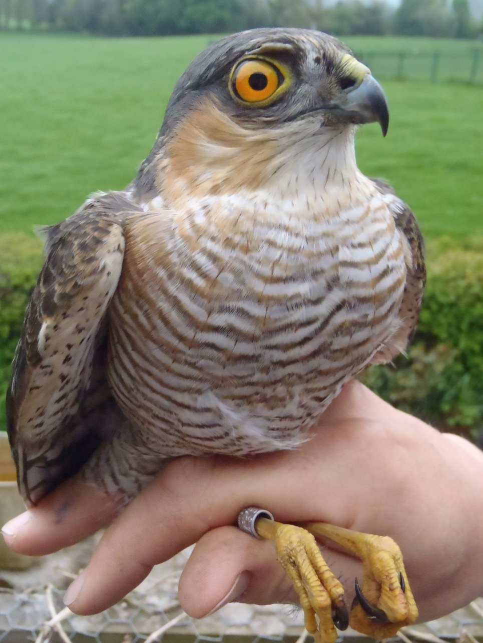 To catch a sparrowhawk takes a lot of luck, and speed. The bird, so focused on catching dinner, does not usually notice a net, but often bounces out before you can get there, running like a loony down the garden with only one shoe on. Sometimes however the bird sticks long enough for you to get there.