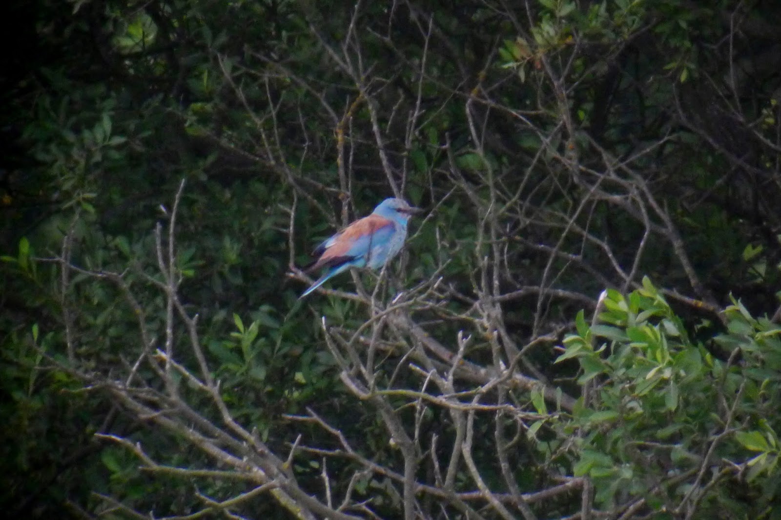 Distant, but totally distinctive, in the trees across the marshy fields sits a European Roller. What a bird! The size of a Jackdaw, with a reddish brown back and brilliant blue body and wings. Breeding in central and southern Europe and wintering in Africa, European Roller’s are a rare bird in Britain and well justified of the stir they cause.