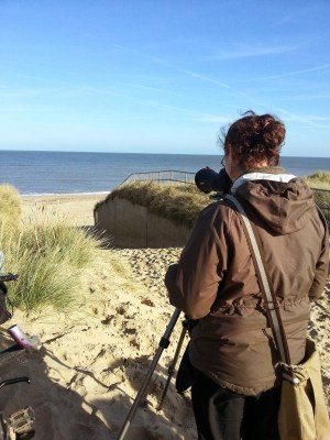 Stormy clouds and rain did not deter us as we wound our way along the narrow roads of the Norfolk coast. Reports of the whale were still coming in; it seemed to be feeding a short distance from the shore, slowly moving northwards. By the time we pulled up in the small village of Sea Palling the sun had broken loose, driving the cloud and rain away. Climbing up the sand dunes we were met with people carrying scopes, heading the other way. ‘It’s moved further north’ were the words, with which we did an about turn and headed back to the car. More winding roads and one diversion later we pulled into the windswept car park of Happisburgh and were greeted by a small crowd of people and their scopes. Surely a good sign.
