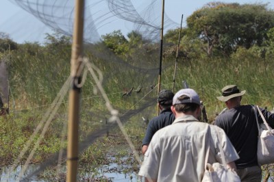 That was until one hot day in January 2014. As the morning progressed a huge flock of 400 bee-eaters began circling overhead, dipping down to take insects off the glittering surface. And here we spotted an opportunity. Until now the birds had not responded to a tape playing their calls, but with so many birds calling to each other, and the presence of food this time it just might work. So with two nets open and a tape playing between we sat back to watch and wait. Minutes later the crackled message came back over the radio at base. Bee-eaters in the net, not one or two, but loads. It had worked!