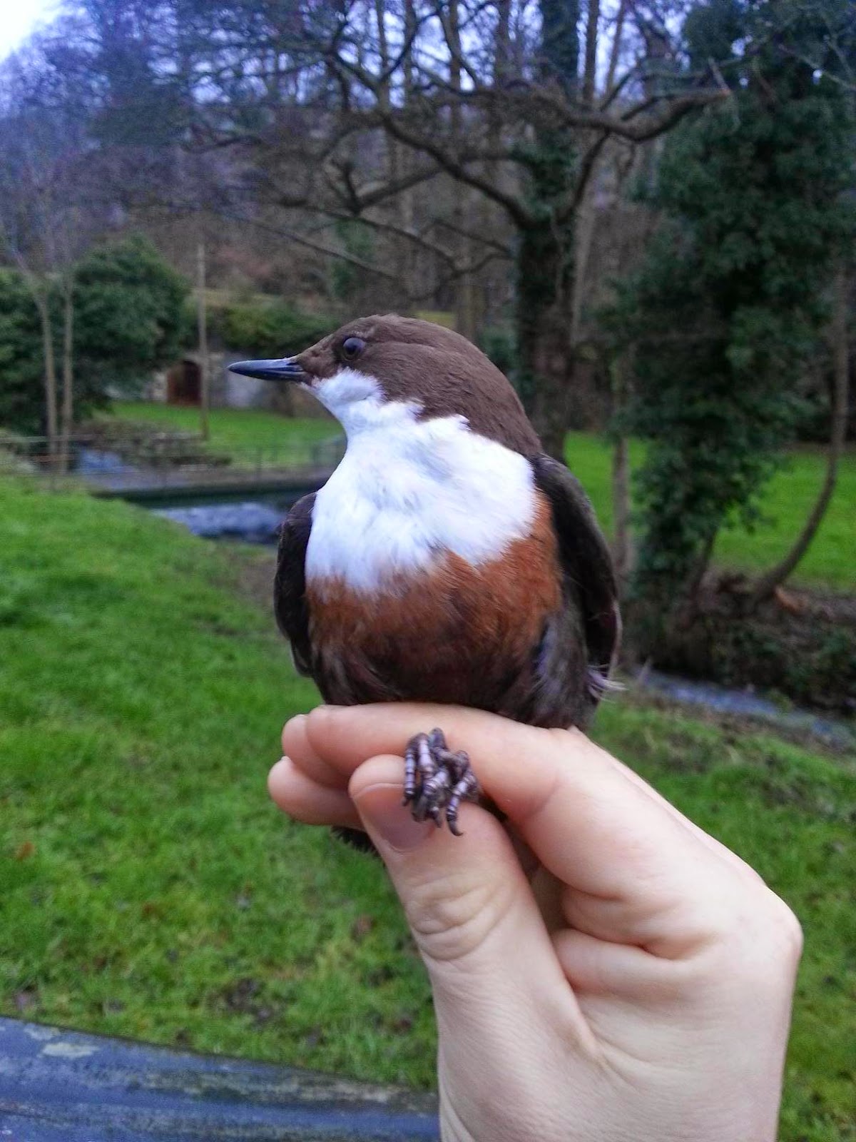 Back on the road, and having emptied the wellies of what seems like half the stream, it is safe to ring and process the bird. Removing it from the bag, the torch light reveals the short-tailed, plump, stocky little brown bird, the feathers on its dark brown back fringed with silvery blue, its brilliant white throat and chest contrasting starkly with a deep chestnut band across the midrift that quickly becomes the deep brown again. Its grip is strong. It needs to be. The bird is the Dipper, and that grip will hold it under rushing water as it searches for food.