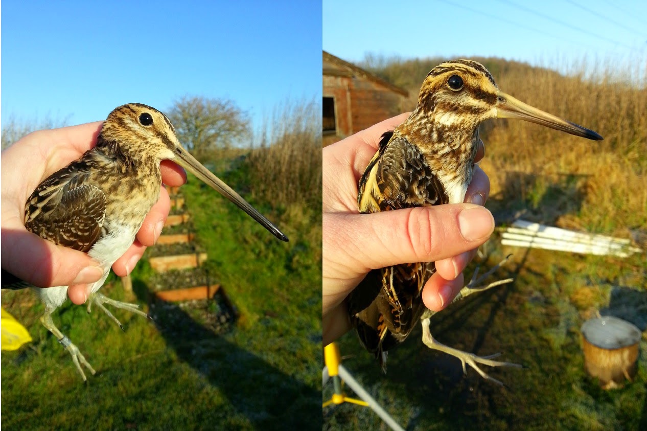 Beyond the tall trees at the edge of the site the brilliant golden sun breaks the horizon, casting its yellow rays across the glittering greens, browns and dun yellows of the pools. In the beautiful winter sunlight we ring and process, learning about these wonderful, cryptic waders. It is brilliant to be able to compare both species at the same time. When complete we release each one, the Common Snipe zoom off quickly, not hanging around. The Jack Snipe however tends to rely more on its camouflage, crouching down until the last moment, flying low and then dropping down again. So when set down carefully after processing, for a moment that is where they stay.