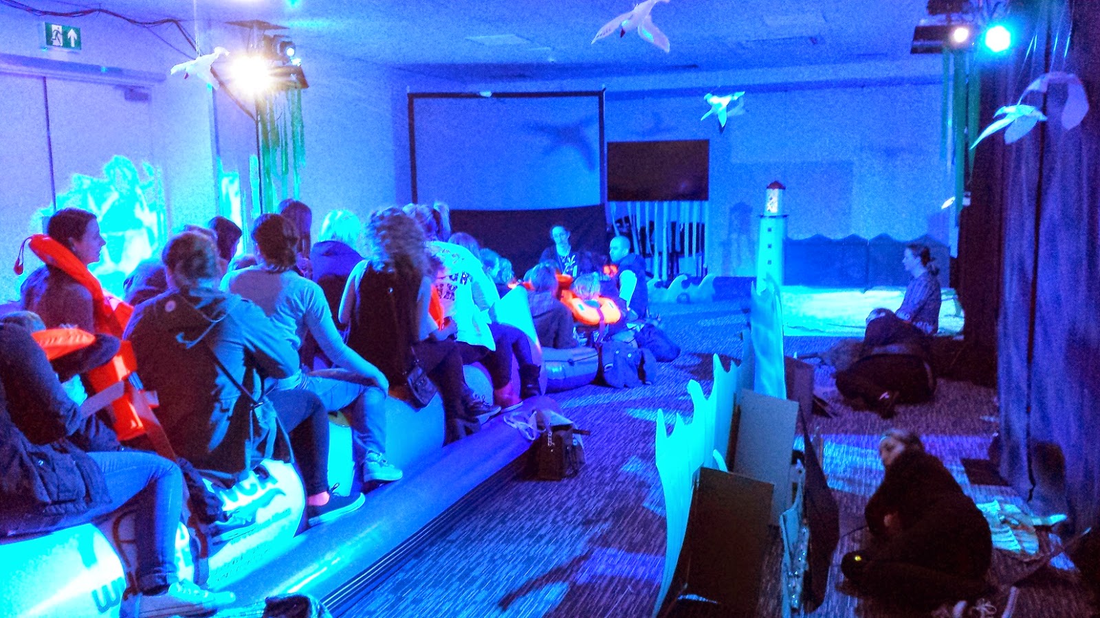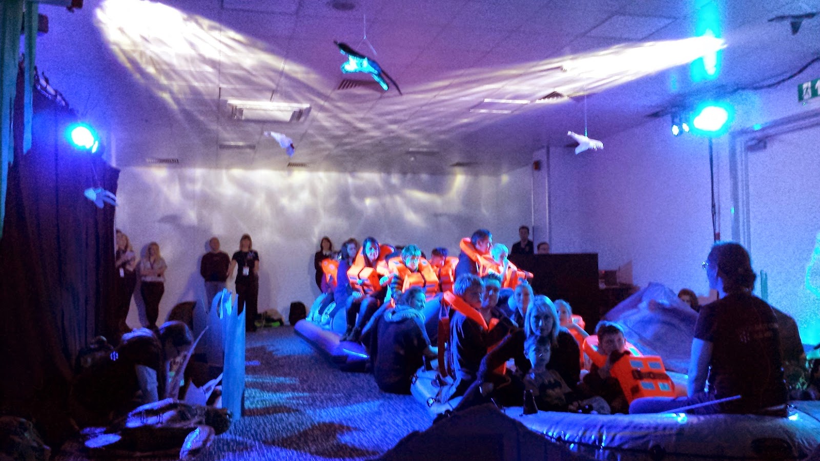 So once again I found myself sitting in a small inflatable boat with a group of kids and adults dressed in bright orange life jackets, bouncing on our new banana-type boat, cast in a blue glow. Only this time there is not one massive screen ahead of us. Around the boat stand up waves are positioned behind which a team of volunteers crouched, hidden from view. Above birds swoop from the ceiling, suspended in this magical blue light. Ahead are positioned two screens, not just one. The trip starts with me again requesting the life jacket whistles not be blown, and for people to remain on board our boat. We run through the responsible whale watching guidelines we will be sticking to should we be lucky enough to see whales and dolphins. Then we are leaving harbour and the calls of gulls and general background noise disappears as the engines gear up. A lighthouse just ahead moves away as we head out to sea. For the next 10 minutes or so whales and dolphins and even a beautiful turtle, appear not just from up ahead but from all sides. The massive dorsal fins of a pod of orca, a head as one spy hops, a stunning turtle swims past (it’s the most amazing turtle I have ever seen anyone make!), a giant sperm whale’s tail gloriously lifts up from behind one of those waves, while yet more whale backs are seen surfacing amongst the waves. The spray of their blow catches the blue light, swirling briefly before disappearing, catching the nearby passengers and making them call out in delighted surprise.