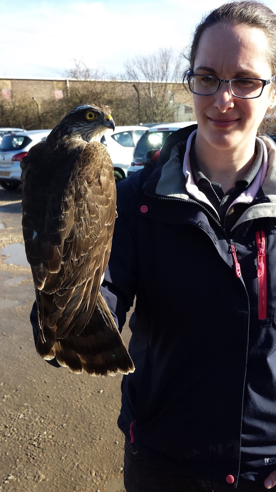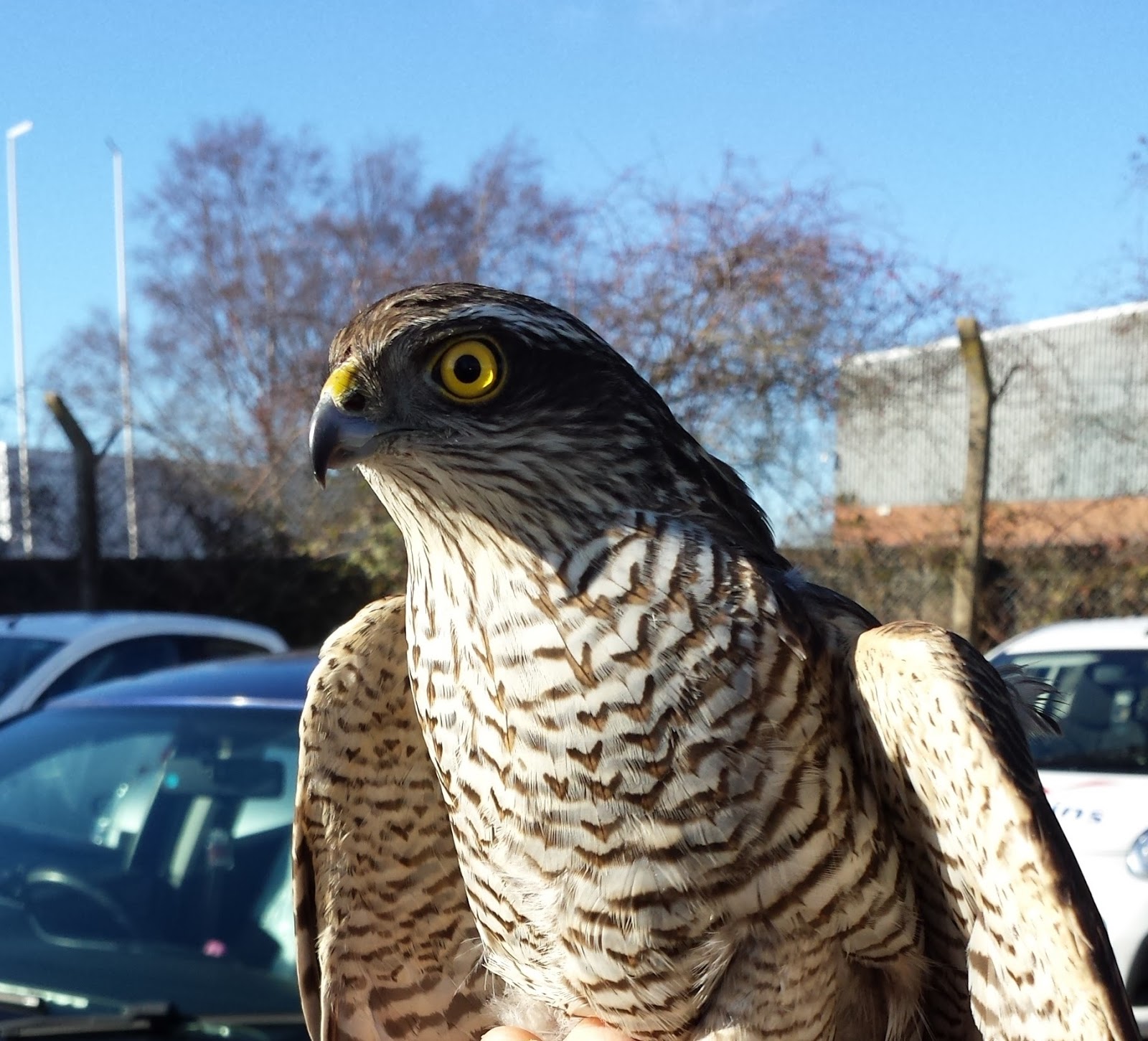 So when Lee received a call mid-week to say there was a sparrowhawk trapped in a workshop in Thetford it was time for us to step into action. Amongst cars in various stages of repair, perched high up amongst the dust, the rafters and the strip lighting a female sparrowhawk sat gazing down. She kicked up dust every time she flew, changing perch as she watched the activity below with a bright yellow eye.