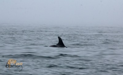 We continue on, the mist closing in once more, the boat guided only by GPS. The guide continues with her spiel, providing interesting information not only on the dolphins, but the bay, its history and geology (one just had to imagine the rock formations she was describing!) With no reference point as to where we were, we simply motor on through the pale grey, until suddenly up ahead something large and dark breaks the surface with a splash. The word ‘dolphin’ erupts from my lips interrupting (in the nicest possible way!) the guide. Four animals break the surface once again, heading for the boat which slows. A dark shape glides beneath the surface right alongside us, before they surface again in the wake of the boat. Eyes scan the water to the edge of the mist, searching. Then boom, two dolphins leap clear of the water in pure synchronicity. They are right on the edge of the mist. Two more breach, their forms more hazy as they disappear into the fog; a brief but none the less breathless encounter. We sit, quiet once more, searching for any sign of the group. The guide calls out; just by the headland she assure us is there, she has sighted a female and her new calf surfacing close by her side. Eyes strain into the mist. Sure enough the faint outline of rocks and coastline appears, a small fishing boat bobs nearby and there breaking the greeney grey water a dolphin followed closely by a small calf. We watch her for a while, before turning for home and heading back into the fog.