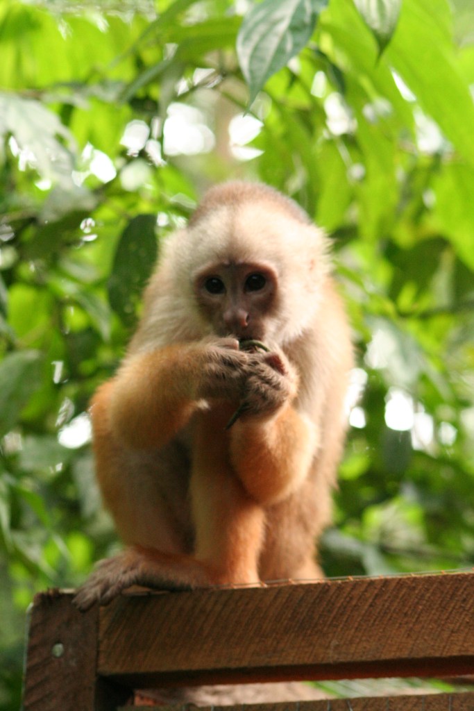 As a volunteer at the reserve one of the daily activities was the care of the animals housed in enclosures around the Lodge. On our arrival there were numerous different parrots, from Blue and Yellow, Chestnut-fronted and Scarlet Macaws to Blue-headed, Mealy and Yellow-crowned Amazon Parrots. There were monkeys; white-fronted capuchins, brown capuchins, black spider monkeys and squirrel monkeys. There was a baby peccary affectionately known as Winston and a young tapir called Whinney. There was also a rather fearsome jaguar, who had been mistreated as a cub and now was aggressive and fearful of humans. And my absolute favourite, a beautiful ocelot.