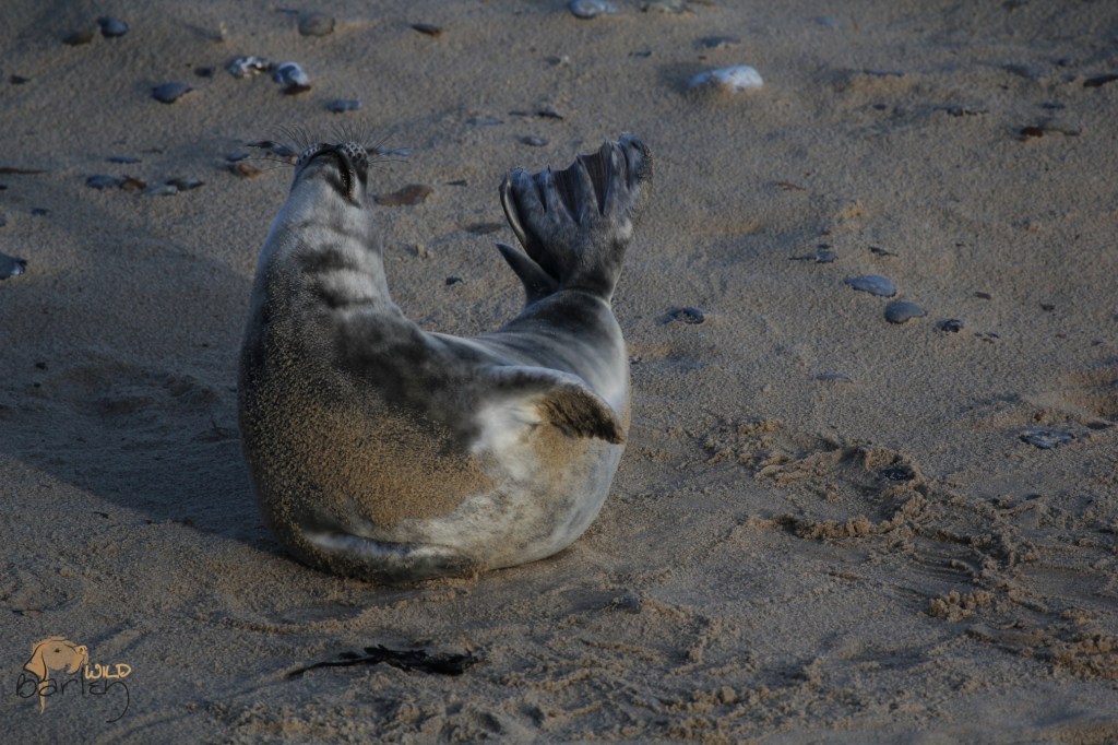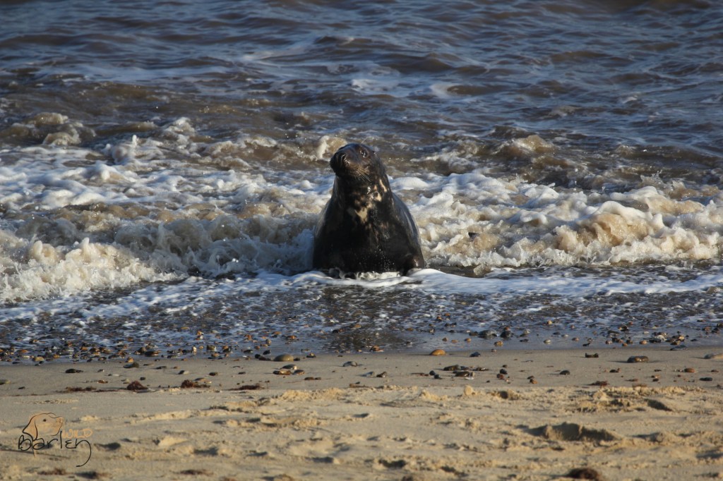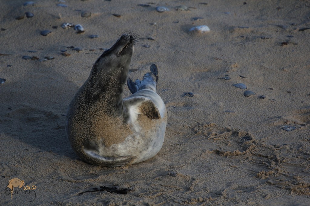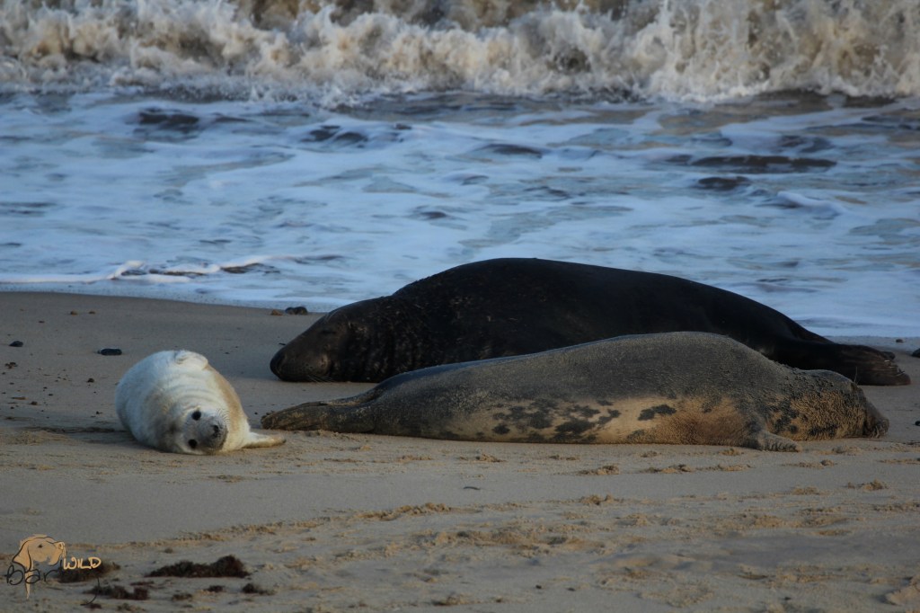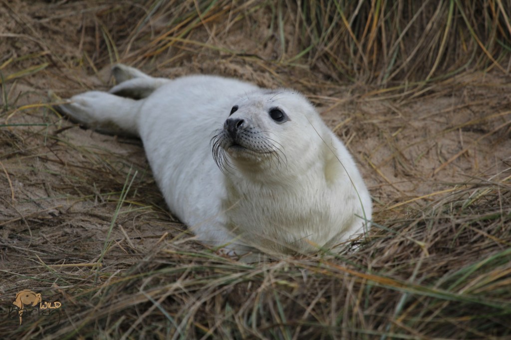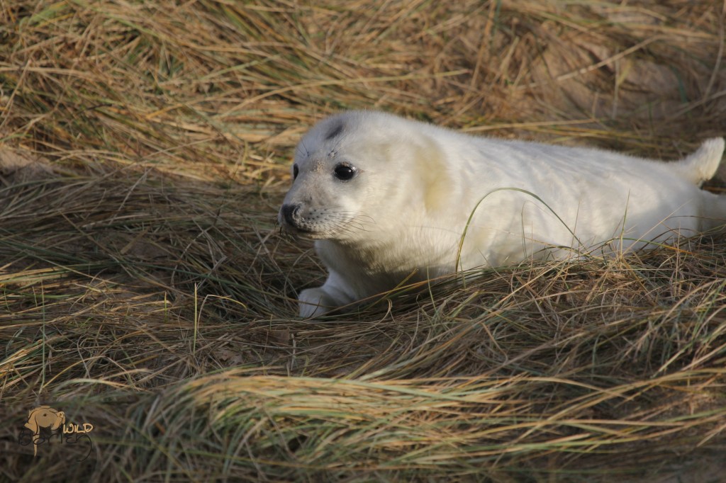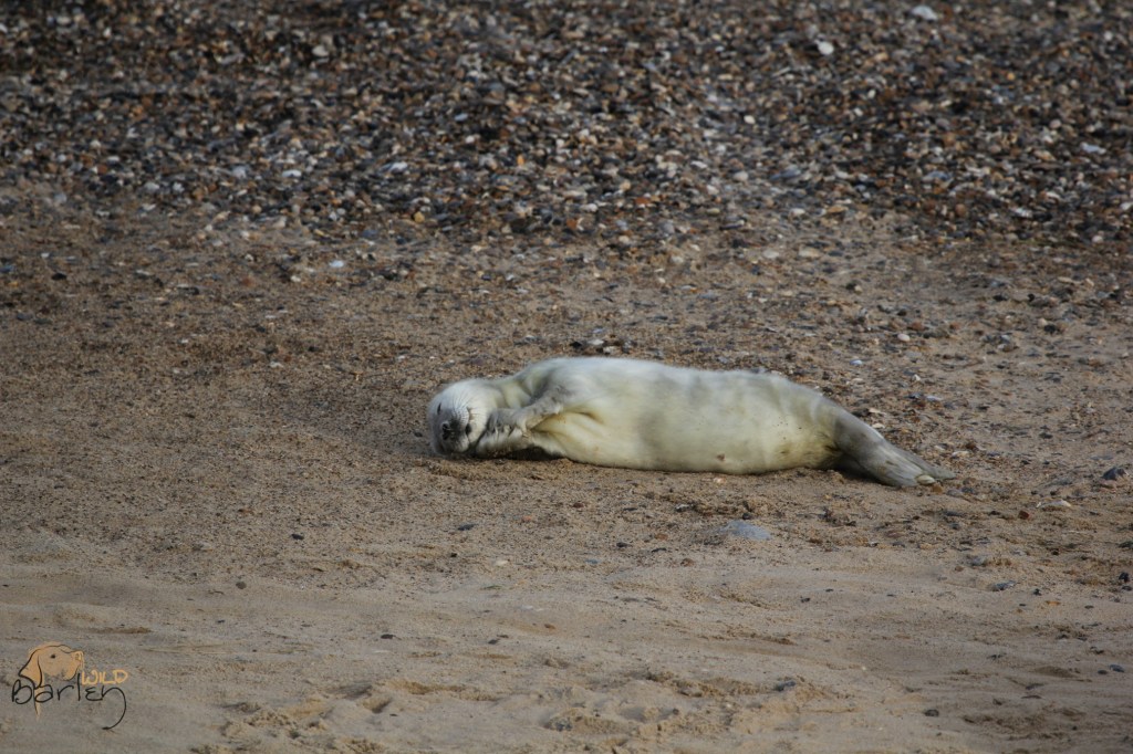 It was one of those winter days where soft light suffuses the air. The golden light from a sun still low in the sky despite the late hour of the morning, softened even further by hazy white clouds. Standing at the top of of a dune, spiky green grass poking up through the sand, I gaze out at the silky, blue, calm sea that stretches to a horizon lost in haze. There is only the slightest of breezes. Small waves roll gently onto the beach below and scattered along the sand, from the gentle surf to the foot of the dunes, and even within them, are the recumbent shapes of grey seals. From big, dark bull, smaller mottled females in lighter shades of browns and greys, to silvery grey, spotty older pups, right the way to white fluffy pups just a few days old. As far as the eye can see right the way up and down the beach there are seals. From Horsey Gap, all the way to Winterton, this stretch of the Norfolk Coast is one of two major breeding sites for grey seals in the area, and is one of the largest on the UK. Up to 2,000 pups will be born on this stretch alone.