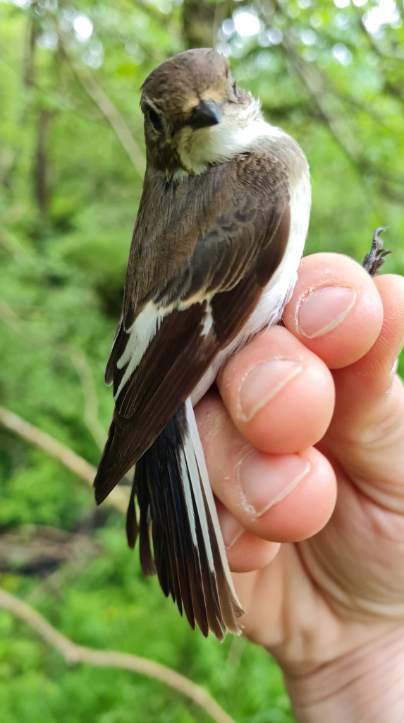 A week of catching adult Pied Flycatchers from the nest boxes, the brown and white of the females and black and white of the male.
