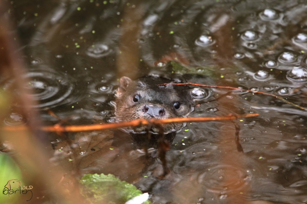 Something makes me stop near a little sign. I smile again as a memory of my little Robyn always pointing to this sign and the carving of mute swans on it. From the corner of my eye, I catch sight of bubbles. Not bubbles from rain drops this time, but bubbles coming from beneath the water. Disturbed silty mud drifts under the surface. Something is down there. I stop and hold my breath. The bubbles and silt move in wiggly patterns as whatever is down their turns around on itself. Then a head pops up and I breath out a quiet gasp of delight. Otter. Right under my feet. She looks up at me and we stare at each other for the briefest of moments. Then the head disappears.