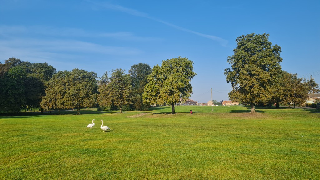 Just as we got to the bridge over the river, she slowed, not liking to walk through the narrow gap of the bridge walls. However, the easiest access for the river was on the other side, and with a bit of patience and gentle encouragement, she started moving again. It was then that I heard the distinctive wing beats, thwumping sounds of swans in flight and looking back and up I saw C9 and FN come careening towards the trees that grow closer together at this end of the common. Wincing I watched one crash into the canopy, crumpling to the ground, and the other tumble to the ground, narrowly avoiding the trees. There was a moment, a pause, and then fortunately both got up and started walking towards me and the bridge. I let out a sigh of relief that they were both seemingly OK. Someone or possibly a dog must have spooked them up on the common.