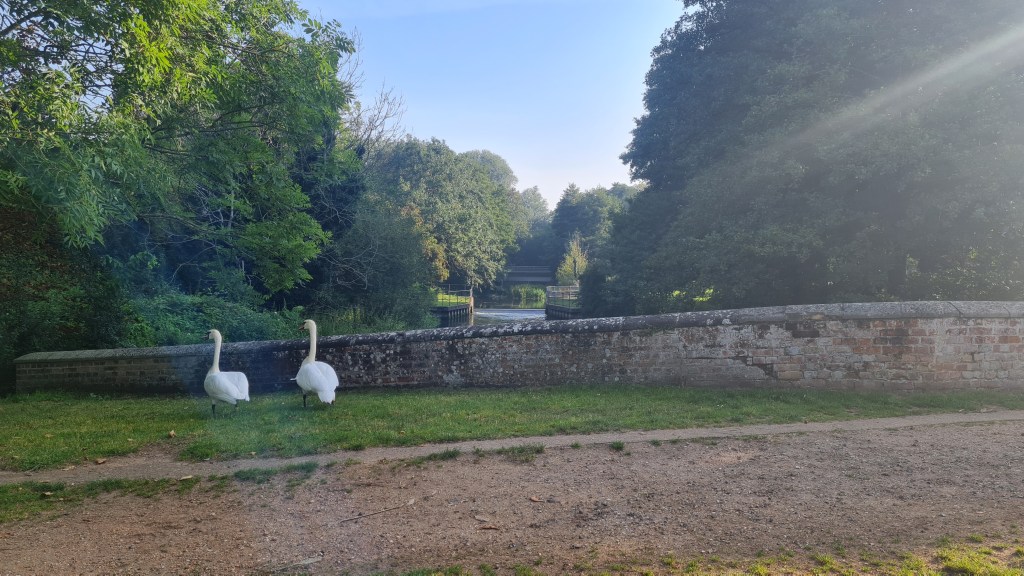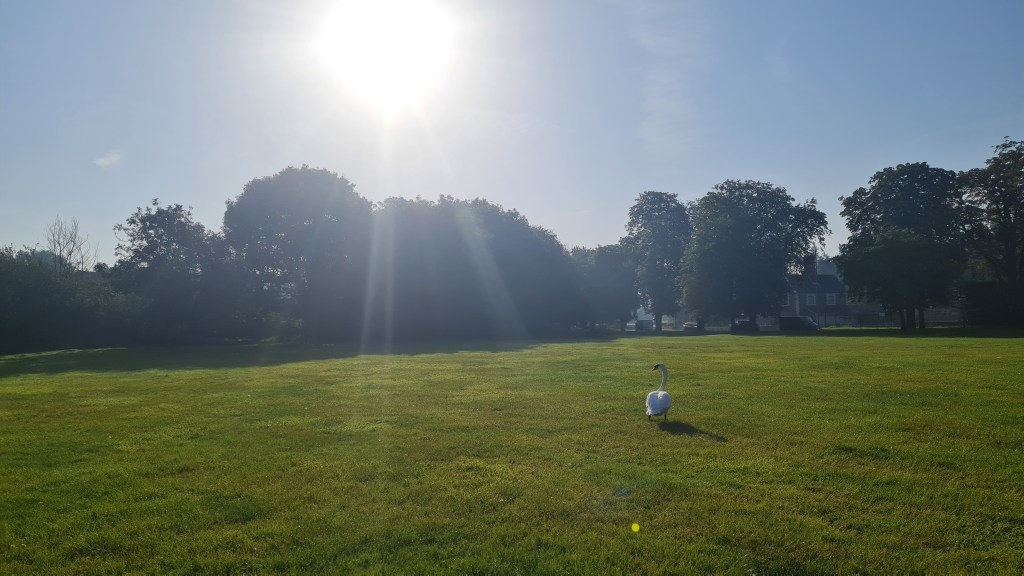 It was not what I expected on a Sunday morning dog walk. Knowing the heat of the day was to come, I headed out earlyish to walk Barley. All was normal as I wandered down the long grass of Melford Common, down the gentle slope that leads to a small road that splits the field in two. It wasn’t until I crossed that road and came to the lower part of the common that I saw them. Three Mute Swans standing in the field a fair distance from the river.