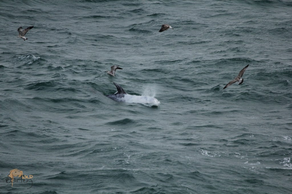 However our encounters with cetaceans on that blustery headland that morning was not over. As we walked back up to the lighthouse fins once again caught my eye. Only this time they were smaller, and accompanied by a head with a distinct beak, unlike the rounded, beakless, blunt head of the Risso’s dolphins. A slender body and a flash of yellow confirmed these dolphins to be Common Dolphins. They zoomed past close in very quickly but once we reached the top of the headland we could clearly see a pod of at least 30 or more moving and feeding a little further offshore. They stayed at that distance for a good length of time, surfacing this way and that, sometimes slowly, sometimes with a spurt of speed that brought more white water amongst the waves, clearly chasing fish and feeding.
